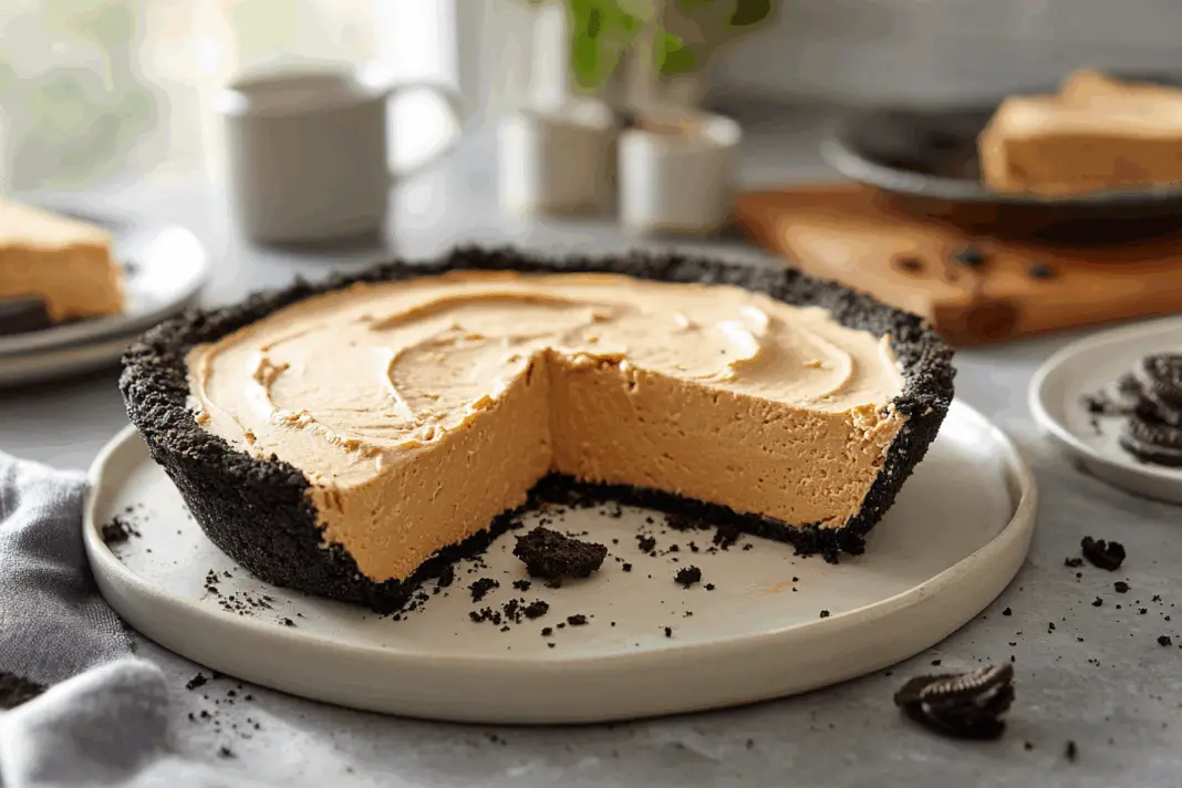 kcalA ridiculously simple no-bake peanut butter pie with an Oreo crust and fluffy peanut butter filling that tastes like it came from a fancy bakery.