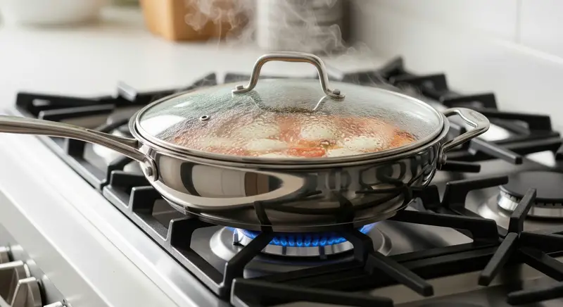 Now comes the easiest part, just waiting. Keep the lid on the pan and let the pizza steam for about one minute. During this minute, the trapped steam is working its way around the cheese and toppings, warming everything evenly. The sauce heats up, the cheese gets melty and gooey again, and any toppings like pepperoni or vegetables warm through. Meanwhile, down below, the crust stays in contact with the pan and maintains that crispy texture you created during the first two minutes. It’s like the pizza is getting reheated from both directions at once.